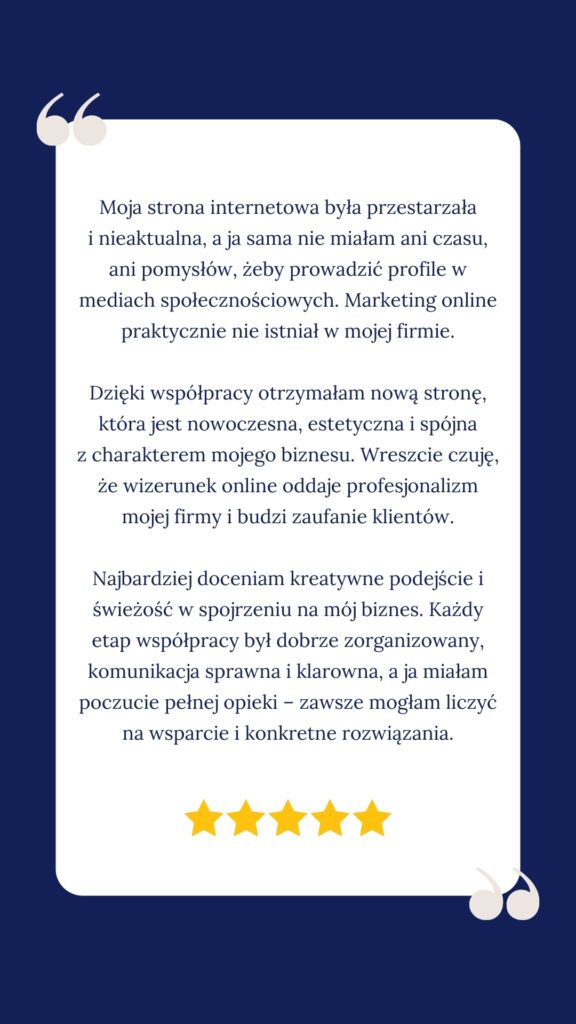 Być może Twoja firma działa świetnie offline, ale w internecie cisza. Masz dobre usługi, zadowolonych klientów, ale online niewiele osób o tym wie. Strona nie oddaje jakości, Instagram przypomina przypadkowy kolaż, a LinkedIn leży odłogiem. I nie, że Ci się nie chce, a dlatego, że po prostu robisz to wszystko sama. A kiedy wszystko jest na Twojej głowie, brakuje czasu i energii, by zajmować się marketingiem tak, jakbyś chciała.